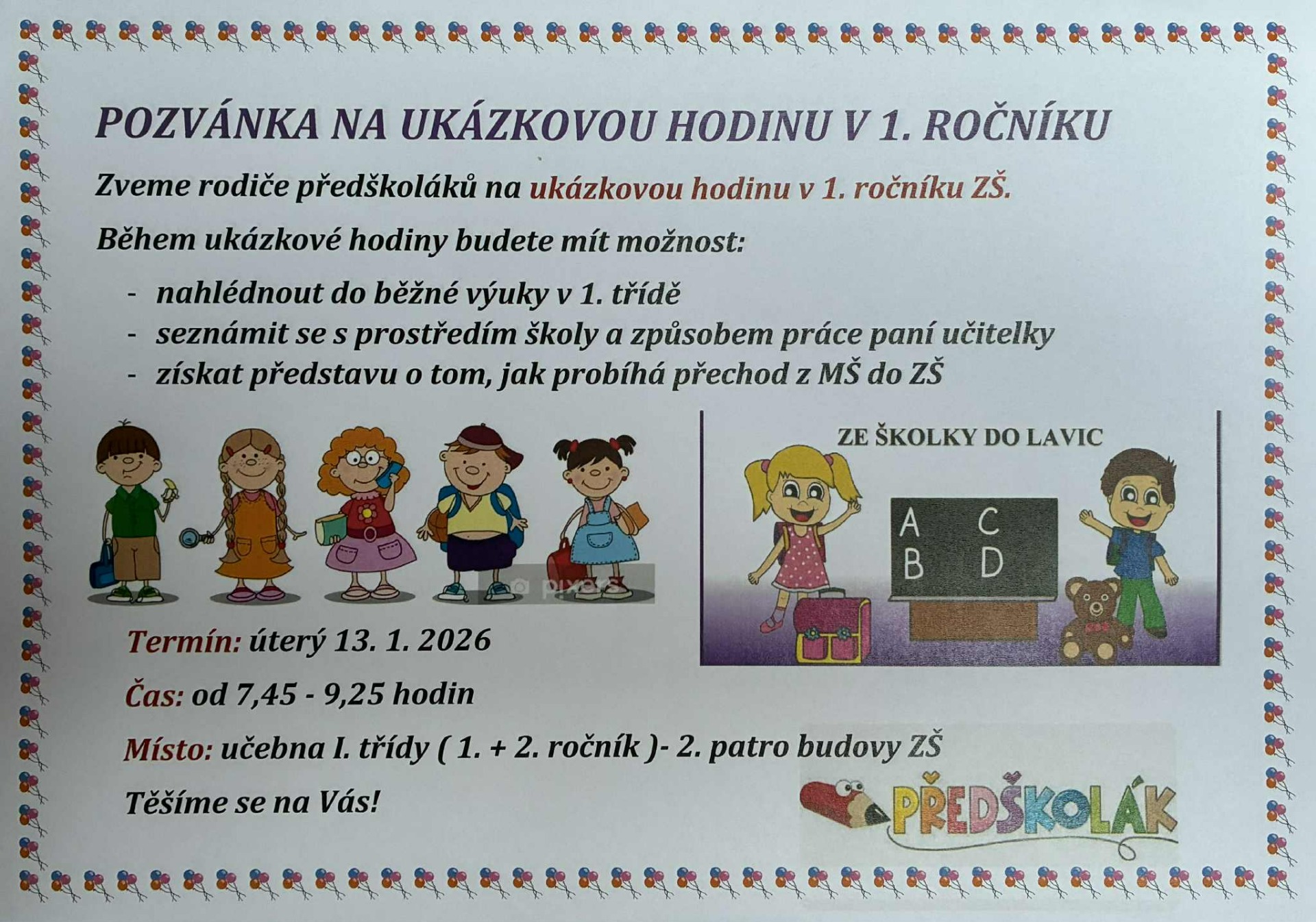 POZVÁNKA PRO RODIČE PŘEDŠKOLÁKŮ NA UKÁZKOVOU HODINU V 1. ROČNÍKU ZŠ