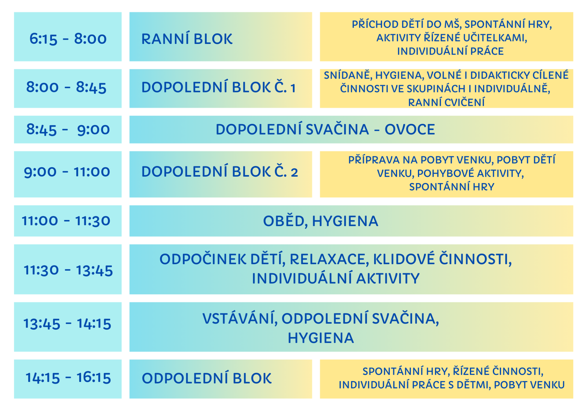 Režim ve třídě je stanovený s ohledem na psychohygienické podmínky. Je pružný a flexibilní, aby umožňoval organizaci činností a aktivit v průběhu dne přizpůsobit aktuální situaci, potřebám a odpočinku u jednotlivých dětí, protože mateřskou školu navštěvují i děti mladší tří let. Pevně je však zakotvena doba pobytu venku, čas oběda a odpoledního odpočinku.